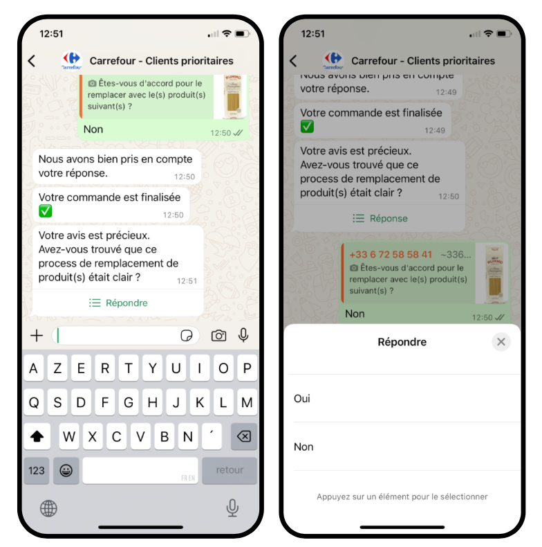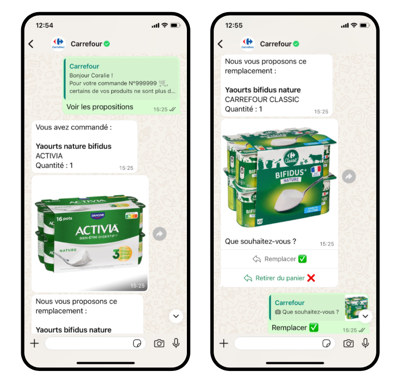Carrefour’s ambition is to make WhatsApp the primary interaction channel for online grocery. When a product is unavailable during preparation, the order picker (supported by AI) sends a substitution suggestion directly on WhatsApp. The customer can accept or decline in one click, without leaving the chat.